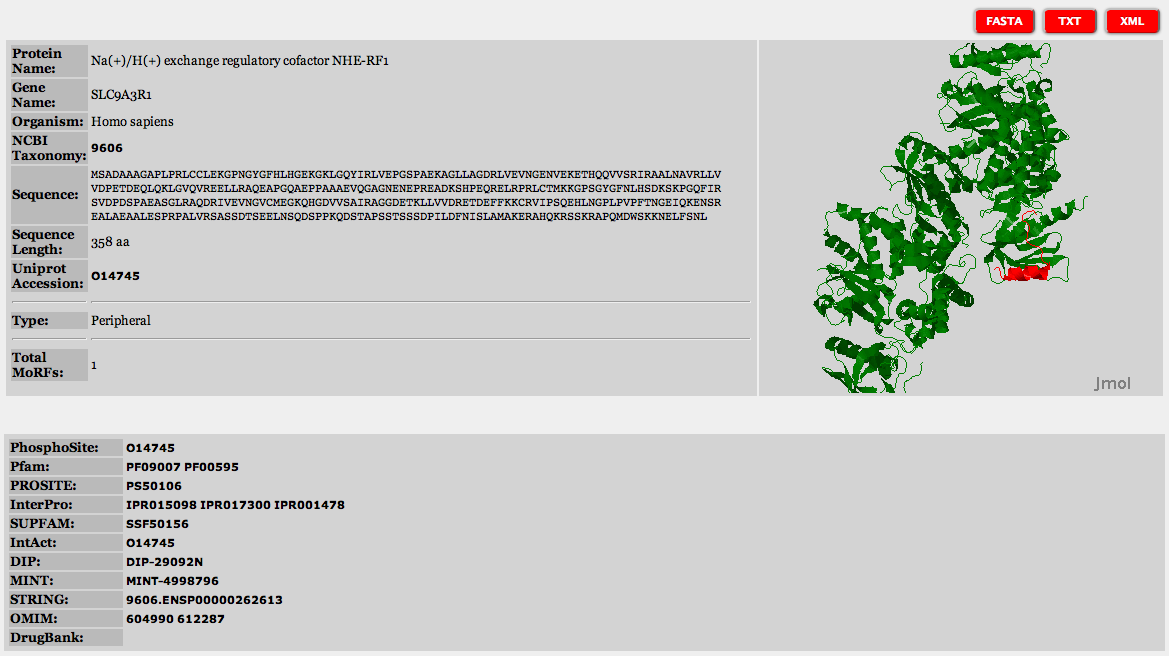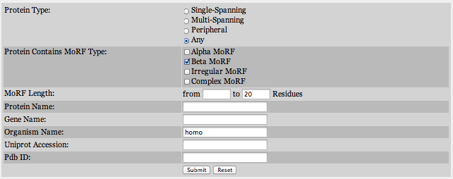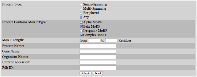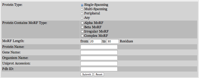 · Search proteins containing specific types of MoRFs. MoRFs are